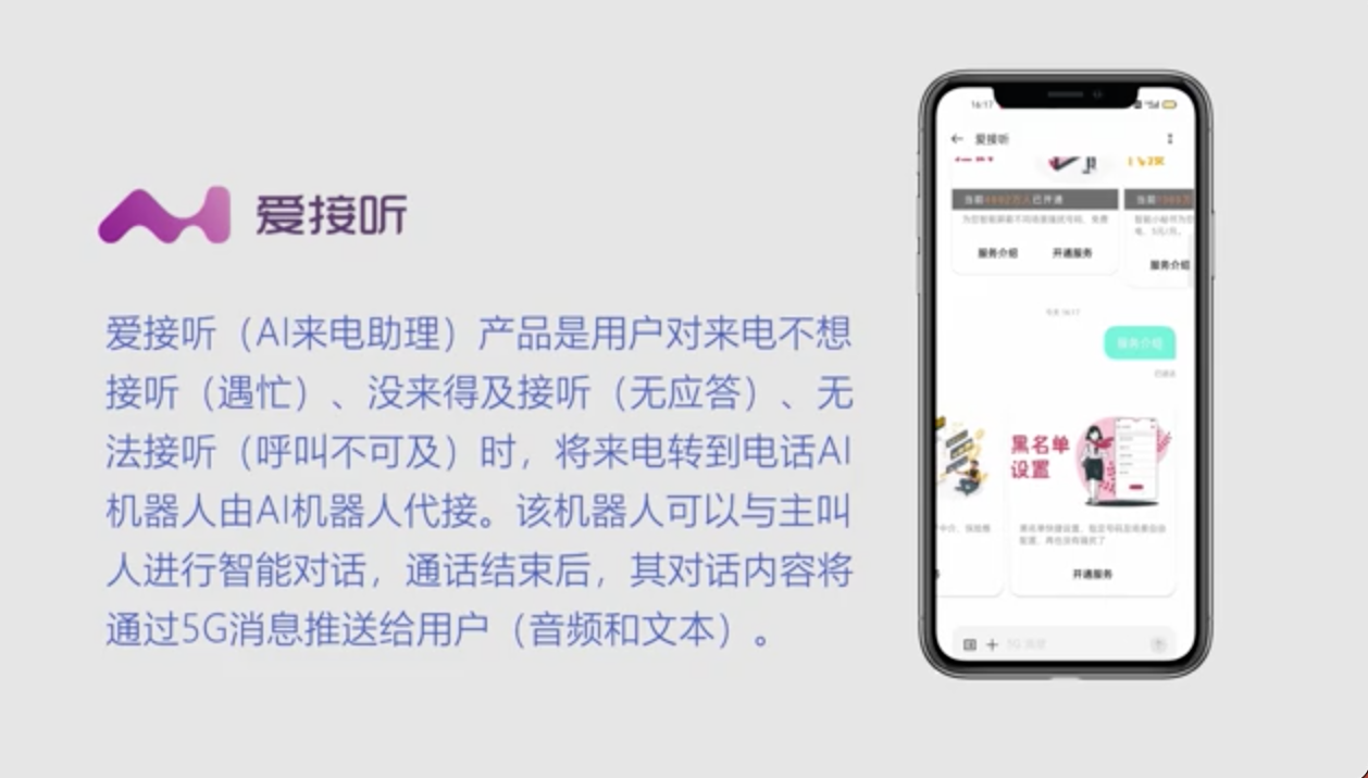 l 针对C端用户,爱接听解决了每个人都可能遇到的“不想接听(骚扰)”、“不便接听(遇忙)”、“没来得及接听(无应答)”或“无法接听(呼叫不可及)”等问题场景。